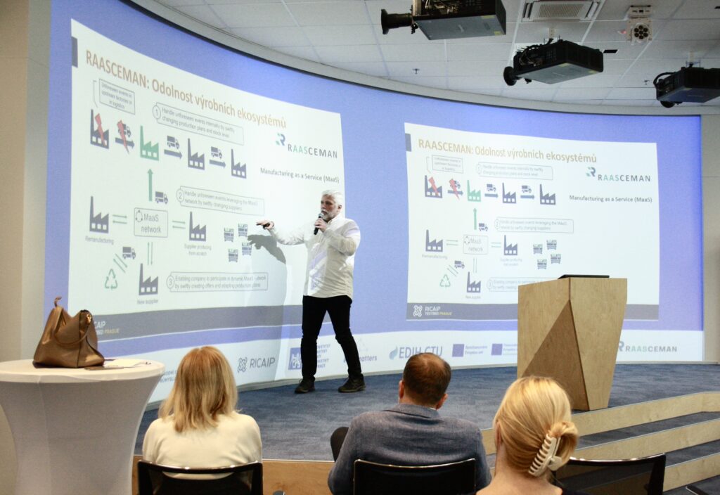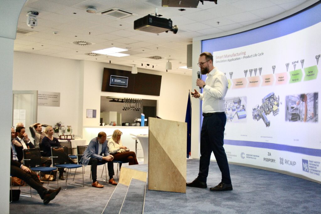 A major highlight of the event was the presentation of the collaboration between AUMOVIO CZ and the RICAIP Testbed Prague, delivered by Pavel Burget (CIIRC CTU) and Jakub Hamerník (AUMOVIO). They demonstrated how this cooperation contributed to the digitalisation of the company’s plant in Brandýs nad Labem, helping it become part of the Global Lighthouse Network of world-leading manufacturers. They also presented the use of a digital twin of the production line in the NVIDIA Omniverse environment and follow-up activities within the RAASCEMAN project, which focuses on building resilient and adaptable supply chains.